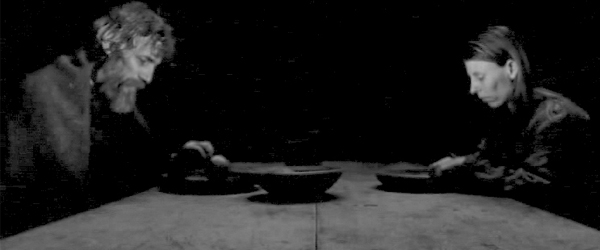 Det finns tre personer i filmen plus själva hästen då. Mannen Ohlsdorfer (János Derzsi), dottern som jag inte hörde nämnas vid namn en enda gång under filmen men hon spelas i alla fall av Erika Bók och ytterligare en man vid namn Bernhard (Mihály Kormos). Under långa scener som utspelar sig i realtid, där ingenting är nerklippt får vi följa man och dotter i deras vardag. En vardag man inte direkt avundas. Hon hjälper honom att klä på sig, en procedur som kan ta sisådär 4-5 minuter. Under denna tid är det alltså allt som händer. Ibland har gubben somnat och vi får se honom sova. Ja, så där håller det på och det är inte konstigt att Tarr behövde över två timmar på sig att berätta sin historia. Det springer ju snabbt iväg när varje vardagssyssla snittar ett par minuter i utförandetid. Ibland inträffar händelser som tar betydligt längre tid. Att gå till brunnen och hämta vatten är exempelvis en tidskrävande manöver eftersom brunnen ligger en bra bit bort från huset. Men framför allt måste vi prata om potatisen för här äts det potatis. Eller nej förresten, det inte bara äts potatis, det tillagas även potatis i utdragna scener. Vi ser knölarna ligga där i vattnet som sakta kokar upp i den gamla järnkitteln. När potatisen sedan skall ätas så görs det under andakt, det tar sin tid och eftersom det inte finns några bestick så används händerna för att trycka in stora glödheta bitar i munnen. För att det inte skall bli för enformigt så byter man kameravinklar då och då.