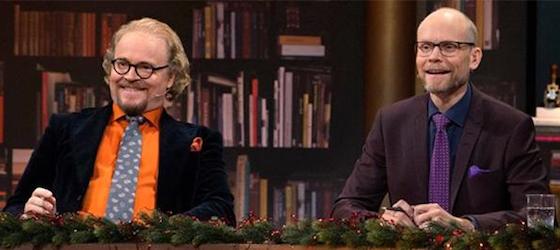 ”Det är som Centralbahnhof i Düsseldorf”, säger Fredrik Lindström i programmet. Och det är en rätt bra beskrivning. Det osar retrochic tågstation av europeiskt snitt. Gott så. Däremot ståtar bakom programledarduon en sådan där tapet som föreställer välfyllda bokhyllor. Jag kan ha fel, men det ser ut som tapet. Ett jädra oskick det där. Jag betraktar bokhylle-tapeter som det starkaste tecknet på kulturens förfall. Det kanske blir så när man har en statsminister som har ”en väckarklocka” på nattduksbordet. Eller som min sambo sa, halvt på skämt, halvt på allvar: ”Böcker är en fantastisk inredningsdetalj.”